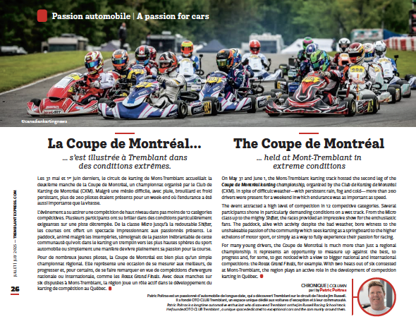 Les 31 mai et 1ers juins derniers, le circuit de karting de Mont-Tremblant accueillait la 2e manche de la Coupe de Montréal, un championnat organisé par le Club de Karting de Montréal (CKM). Malgré une météo difficile, avec pluie, brouillard et froid persistant, plus de 260 pilotes étaient présents pour un week-end où l’endurance a été aussi importante que la vitesse.